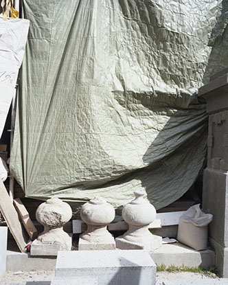 Dans ces conditions de chantier (il ne s’agit pas ici d’une installation artistique), l'ange est protégé alors que son support ouvragé tout aussi précieux reste sans défense face aux éventuelles dégradations. C'est un peu comme si seule la dimension spirituelle devait être préservée des actions matérielles. A moins qu'il ne s'agisse de la stricte application des normes en matière de coordination sécurité santé, application à laquelle même un membre de la cour céleste ne pourrait déroger? Ou de la manifestation fortuite d’un trait d’esprit spirituel où le comble du « ciel » serait de craindre qu’il ne tombe sur sa propre tête, à un tel point qu’il ne dusse se protéger de sa défaillante omnipotence? Plus sérieusement, cette attention scrupuleuse portée envers cet ange est-elle l’expression de la profonde dévotion d’un vicaire zélé ou le geste taquin d’un ouvrier malicieux ?